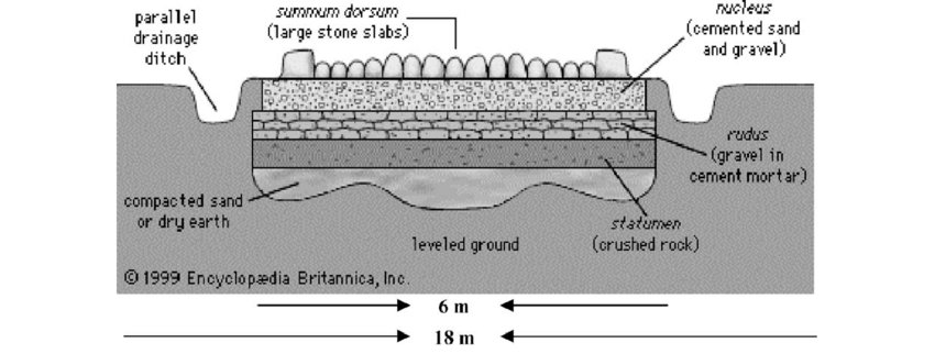 Я тоже не стал исключением из правила, но картинки показал для совсем других целей. Сразу видно древние умели строить - сооружение получается сложным и дорогим, даже с поправками на рабский труд. Ну и естественным результатом этого стало то, что мощеных камнем междугородних дорог было... немного. Остальные же были "ну, дорогами". Иногда мощеными, иногда деревянными, иногда гравийными, иногда вообще не сильно отличались от грунтовки (да, профилированной и с дренажными канавами - но грунтовки). В конце концов, достижение Рима не в камне, а в сети именно дорог, проложенных по плану.
