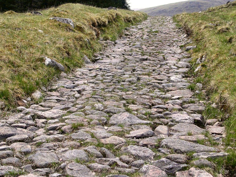 Да, это не дорога, это ее основа! На этот слой насыпалось полтора-три фута (до метра) гравия и получалась достаточно устойчивая дорога, позволяющая круглогодично пропускать армейские конвои, несущие волю короля бессмертным горцам.