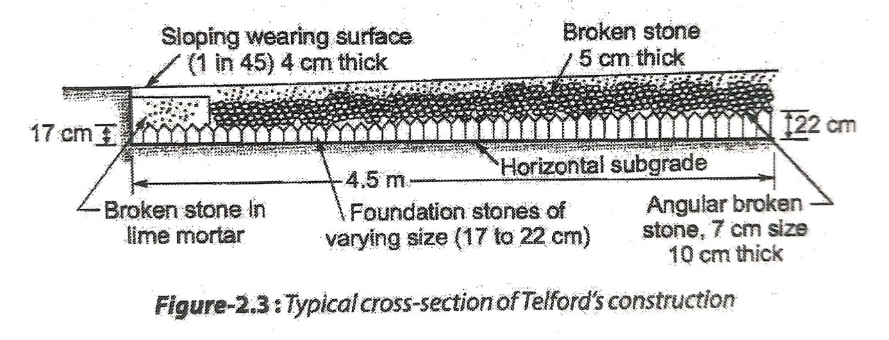 Снова в Англии инженер Томас Телфорд в начале уже 19 века пытался получить из идеи "щебеночной дороги с несущей основой" нечто более приличное. Он предложил во-первых обеспечить нормальный дренаж и водоотвод. Во-вторых, Телфорд считал, что дорога должна выдерживать любую представимую нагрузку, так что на основу он предложил укладывать слой отесанного камня плоской стороной вниз. И укладывать не как попало, а с перевязками, как лучшие каменщики! Такой камень в русскоязычном мире известен как "пакеляж". Промежутки между пакеляжными камнями засыпались мелким щебнем, на них укладывался слой в 6 дюймов крупных камней в 2,5 дюйма размером. А сверху - снова мелкий гравий. Здесь ключевой особенностью дороги стало улучшенное водоотведение и дренаж. Но пакеляжная кладка оказалась удручающе (по меркам паровой эпохи) трудоемкой и настойчиво требовала себе замену.