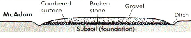 Замену нашел английский же инженер Джон Макадам. Свой проект дорог он разрабатывал почти одновременно с Телфордом, в те же первые десятилетия 19 века. Как и Телфорд, Макадам понимал важность водоотвода и дренажа, но, в отличие от Телфорда и Трезаге считал даже облегченный фундамент совершенно избыточным. Что же он предложил: